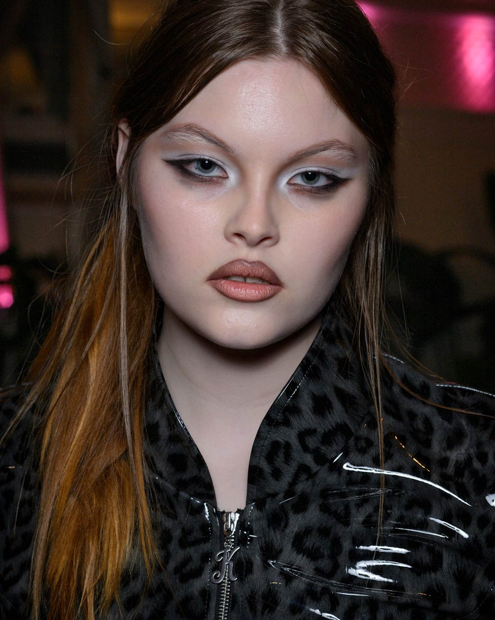 Kẻ mắt đen toàn viền chưa bao giờ lỗi mốt, nhưng năm nay, nó trở lại với phong cách grunge cá tính. Tại show Kim Shui, chuyên gia trang điểm Romero Jennings đã lấy cảm hứng từ các “it-girl” như Julia Fox để kẻ mắt đen vòng quanh. Sau đó, anh làm mềm đường kẻ bằng chút phấn màu đồng, giúp đôi mắt vừa sắc sảo vừa có chiều sâu.