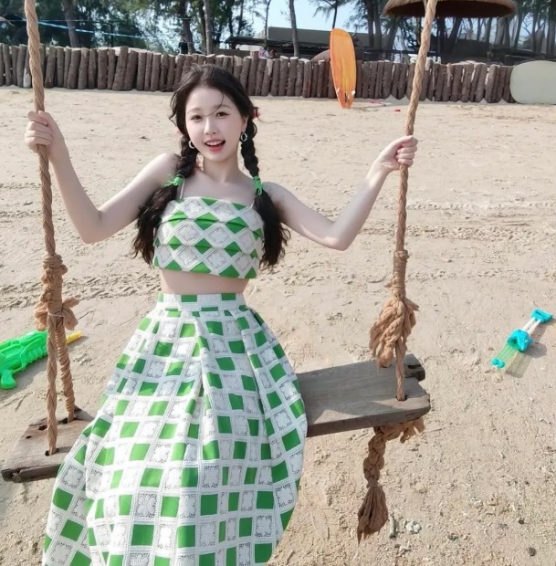 Chính bởi vậy mà có rất nhiều sao Hoa Ngữ chọn kiểu tóc này khi đi biển như Ngu Thư Hân với mái tóc tết buông nhẹ, phối với váy caro xanh trắng, dây buộc tóc xanh lá mạ đồng điệu. Nhờ vậy mà cô nàng có được diện mạo trong trẻo, nữ tính. Khi tết tóc, bạn hãy thêm một chút gel dưỡng hoặc serum để có thể hoạt động thoải mái ở ngoài trời mà không bị mất form nhé.